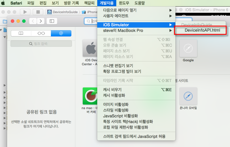이제 아이폰을 연결하고 아이폰에서 사파리나 직접개발한 웹뷰앱을 실행합니다.
